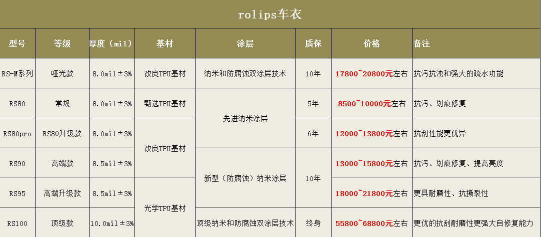 許多車主都在尋找2023新的羅利普斯ROLIPS隱形車衣型號和價格,在這里整理了系統(tǒng)且完整的內(nèi)容,包括車衣的等級,厚度,基材涂層,質(zhì)保年限以及優(yōu)點。來,一起看下吧。