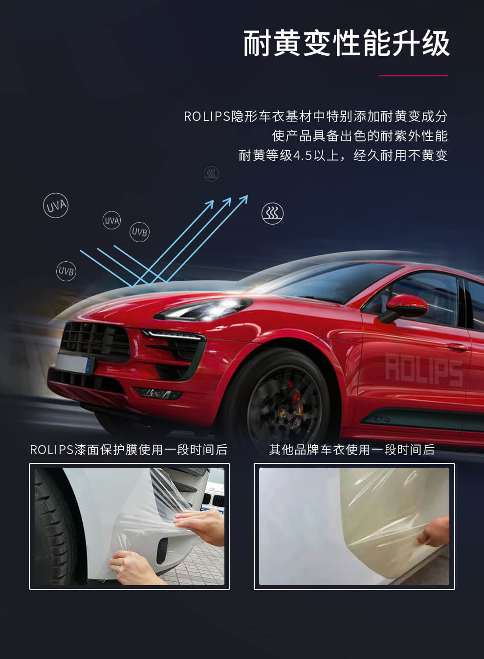 ROLIPS車衣優(yōu)選頂級TPU基材,加上先進的納米涂層技術(shù),嚴格的標準下生產(chǎn)符合大眾要求的高端車衣膜產(chǎn)品,ROLIPS的隱形車衣有效抵御碎石撞擊、輕微剮蹭,常溫下劃痕自修復(fù),同時高度抗腐,持久耐黃。ROLIPS每年平均貼膜150000件以上,用工匠精神完成每一件藝術(shù)品,讓車子能夠得到持久保護。