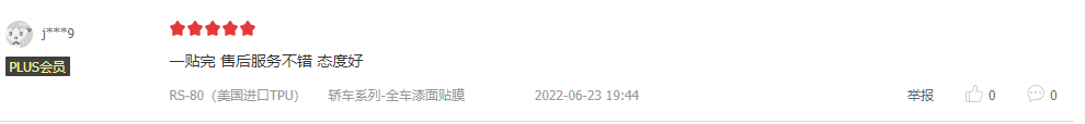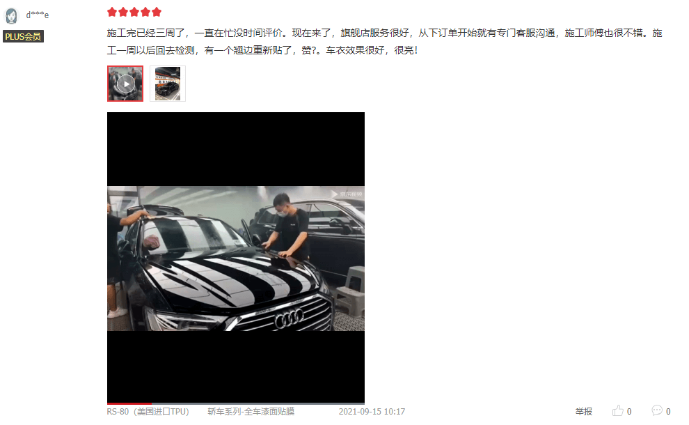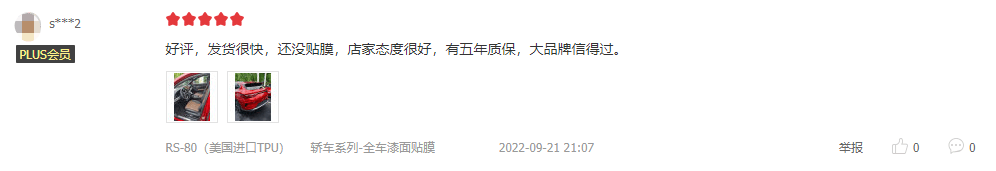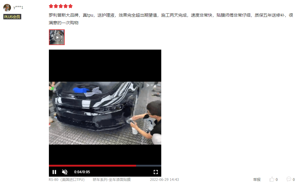 羅利普斯大品牌,真tpu,送護理液,效果完全超出期望值,施工兩天完成,速度非???,貼膜師傅非常仔細,質(zhì)保五年送修補,很滿意的一次購物