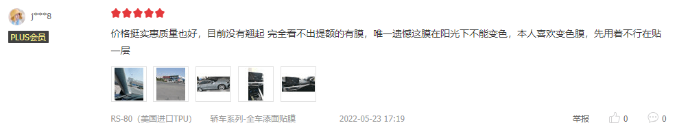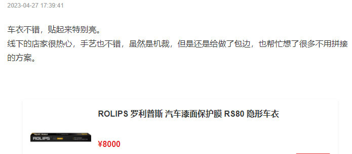 號稱進口品牌中的性價比之王羅利普斯ROLIPS主打的車衣系列--基礎款RS80,RS80甄選全球優(yōu)質(zhì)的TPU,先進納米涂層,Ashland(亞什蘭)壓敏膠,厚度多為8.0mil,質(zhì)保5年,價格8K。那么,這么一款高性價比的車衣,我們要聽聽車主怎么說?